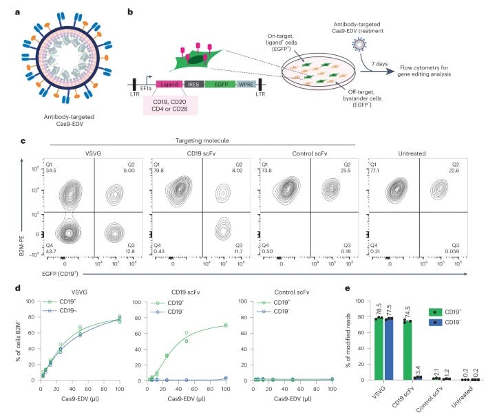Why it matters: Cell engineering has been bottlenecked by limitations in cell-type delivery. In this paper, Hamilton et al develop Cas9-packaging enveloped delivery vehicles (Cas9-EDVs) that have antibody fragments displayed on the surface, enabling transient delivery of CRISPR machinery to target cells, even in mixed populations in vivo. This work unveils a novel, programmable delivery method that shows promise in the therapeutic arsenal for enabling cell-type specific engineering.