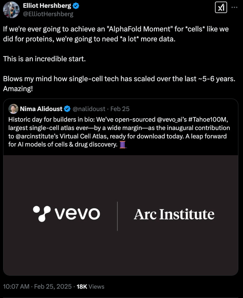 Vevo Therapeutics has open-sourced its 100M cell dataset contributing to the Arc Institute’s Virtual Cell Atlas. This dataset captures 60,000 drug-patient interactions from perturbation experiments, mapping the responses of 50 diverse cancer models to 1,100+ drug treatments.