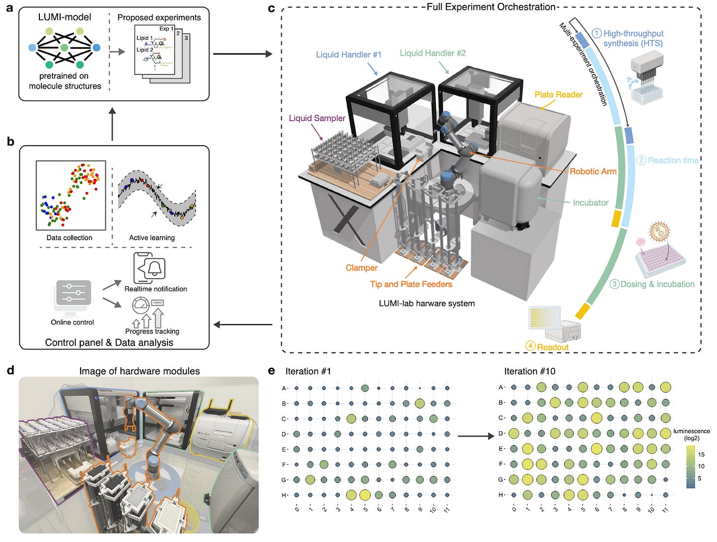 The authors set out to build an SDL to identify new ionizable lipids named LUMI-lab (Large-scale Unsupervised Modeling followed by Iterative experiments). It consists of two primary components: 1) LUMI-model, a molecular foundation model pretrained with unsupervised learning on 28 million structures, which facilitates a few-shot learning of new molecules with minimal experimental data and 2) an automated, closed-loop experimental system that generates wet-lab data to optimize LNPs through ionizable lipid synthesis (via OpenTrons OT-2), LNP formulation, and high-throughput in vitro screening.