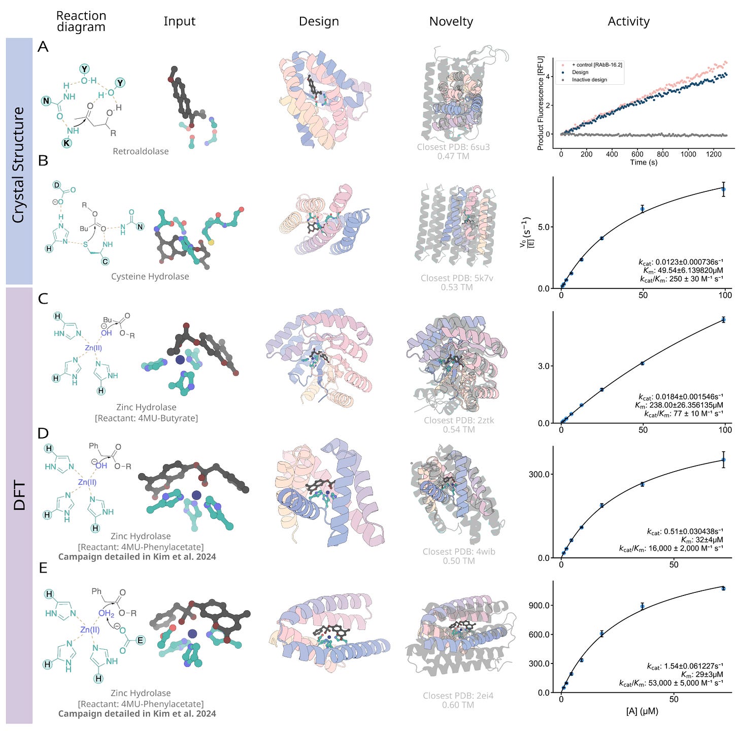 When benchmarked on a newly curated Atomic Motif Enzyme (AME) set of 41 diverse active sites, RFdiffusion2 succeeded in scaffolding all 41 cases, a dramatic improvement over the 16/41 successes of the original RFdiffusion. They experimentally tested designs of enzymes with theozymes sourced either from existing crystal structures of enzymes or theozymes derived from Density Functional Theory. For each of the 5 de novo enzyme design campaigns, they validated more than one functional enzyme in 96 designs.