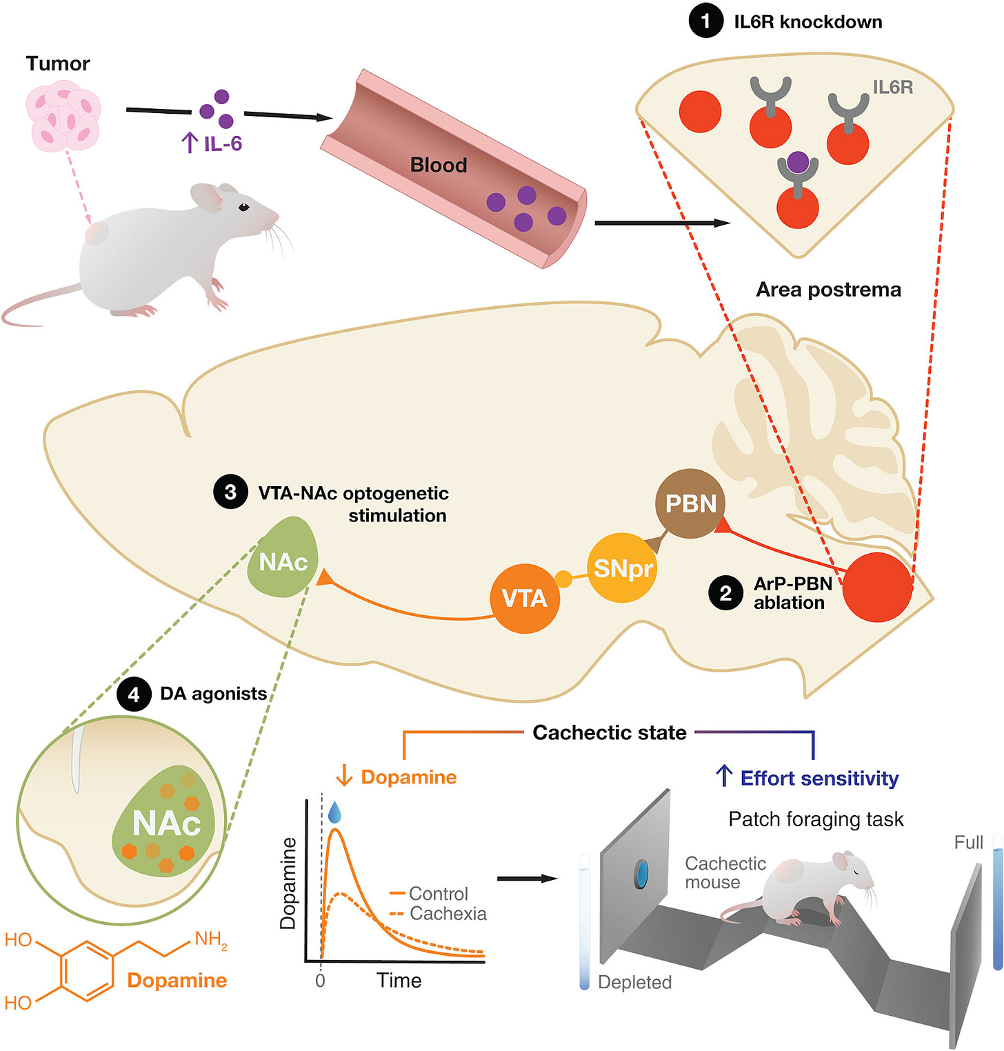 These findings enabled the authors to propose a new neural circuit for effort sensitivity due to cachexia, one that starts as an inflammation response in the ArP, travels through the PBN and SNpr to suppress dopamine neurons in the VTA, and ultimately results in reduced dopamine levels in the NAc. Discovery of this new circuit establishes cachexia as neuronally distinct from anorexia, and indicates that cachexia affects a specific isolated behavioral dimension—effort sensitivity—as separate from anhedonia and despair. This study also has significant therapeutic applications, as existing drugs that affect IL-6 could be repurposed to remediate cachexia.