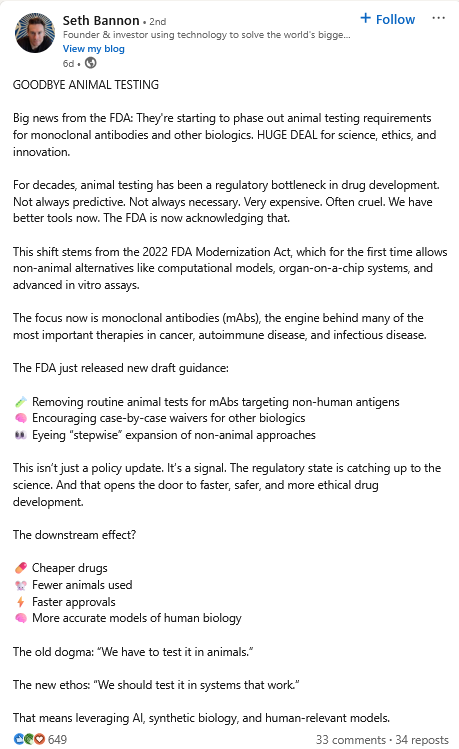 The FDA is making a push to remove animal testing for preclinical safety studies, suggesting instead the use of clinical data from other countries, in vitro models, or predictive AI models.