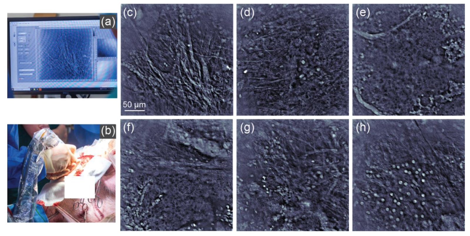They validated the handheld probe to view a human forearm, mouse brain housing a glioblastoma, and a pig brain during surgery. The in vivo forearm imaging resolved keratinocytes, rete ridges, Langerhans cells, and flowing red blood cells (check out the videos they supplied in their supplemental material!). Ex vivo murine brain images captured cortical neuropil, nucleolated neurons, and GL261 glioblastoma regions with multinucleation and nuclear atypia. Human glioma specimens imaged within 6 hours of surgery showed nuclear hyperchromasia and pleomorphism that matched gold-standard H&E staining. Finally, the swine brain imaging under craniotomy conditions provided stable visual feedback that wasn’t affected by pulsation and respiration. Most of these contexts would otherwise require an invasive surgery - the handheld qOBM probe enables surgeons to get histology-like detail, live during an operation, without tissue removal!