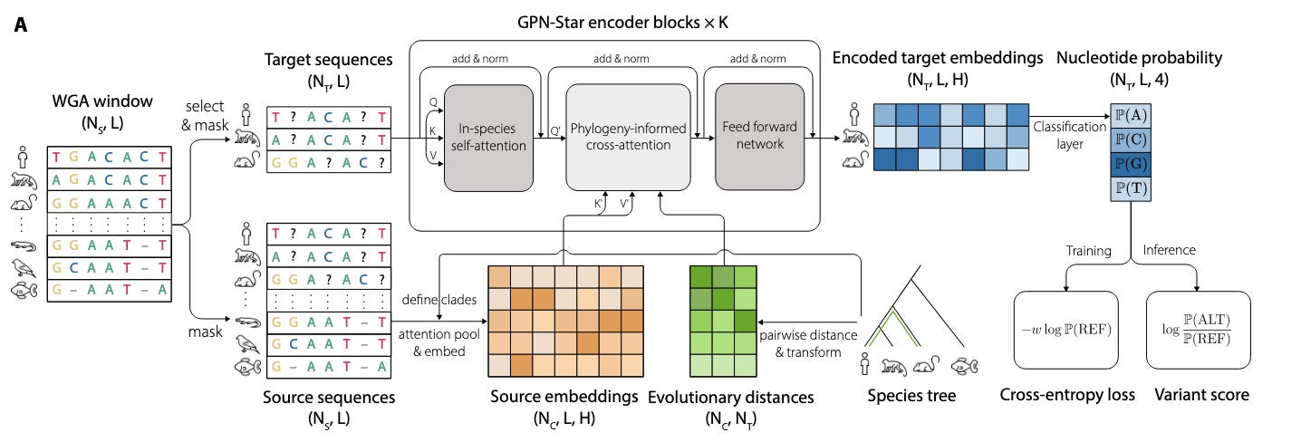 Why it matters: Advances in natural language processing have enabled the development of powerful genome language models (gLMs). While the per-site likelihood predictions of these models have proven useful for predicting variant effect and even paved the way for designing whole new genomes, even the largest sizes gLMs struggle with variant interpretation for eukaryotic genomes. In this work, the authors describe Genomic Pretrained Network with Species Tree and Alignment Representations (GPN-Star), a gLM that utilizes whole-genome alignments (WGAs) and species trees to capture evolutionary relationships. With these capabilities, GPN-Star is able to model how genomes evolve across species and achieve superior performance on pathogenic and GWAS variants, as well as significant gains in trait heritability tasks and rare variant association testing, especially when compared to significantly larger contemporary models.