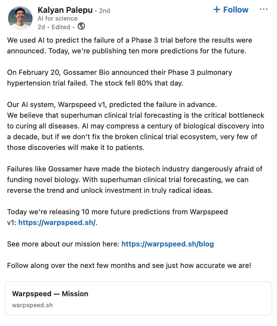 Insilico Medicine signs global R&D collaboration with Eli Lilly worth up to $2.75B. In this deal Lilly obtains exclusive worldwide license for a portfolio of novel oral therapeutics in preclinical development across multiple therapeutic areas, plus collaboration on additional programs using targets selected by Lilly. The partnership pairs Insilico’s Pharma.AI platform with Lilly’s clinical development expertise, adding to the latter’s aggressive AI infrastructure buildout including LillyPod supercomputer and $1B NVIDIA co-innovation lab. In return, Insilico receives $115M upfront, with development, regulatory, and commercial milestones plus tiered royalties. In their press release, Insilico CEO Alex Zhavoronkov emphasizes deploying frontier AI that scales from biomarkers to “life models” to identify multi-purpose targets driving multiple diseases simultaneously, keeping with the company’s devotion to developing deep learning throughout the entirety of the drug discovery process.