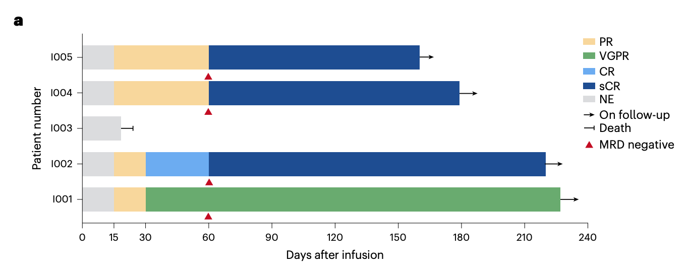 First, the treatment showed clear signs of activity: the overall response rate was 80% (4/5), with responses emerging quickly, at a median of 15 days. By day 60, patient I002 had reached stringent complete response, and patients I004 and I005 had converted from partial response to stringent complete response; patient I001 achieved VGPR and remained there at last follow-up. The fifth patient, who had baseline extramedullary disease involving the spine, died on day 19 from spinal cord compression. The paper notes that this may have reflected inflammatory edema or pseudoprogression associated with CAR-T expansion, although true progression could not be excluded.