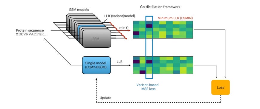 Unlike AlphaFold-style models that are explicitly fed MSAs as input to add evolutionary context, PLMs aim to learn an evolutionary fitness landscape from a series of unaligned sequences. While they still show impressive performance, this approach to training has led to certain deficiencies; for example, the widely used ESM series of models fail to identify conserved structural domains, likely meaning they’d output more false negatives during VEP tasks. Crucially, different ESM models miss different domains despite having relatively similar architectures and training datasets. The authors used this result as the basis for a hypothesis that perhaps the knowledge of multiple ESM models could be condensed into one, and thus developed a multi-step training framework. First, they calculated the log-likelihood ratio for millions of mutations across 11 different ESM models, and recorded the minimum score to establish a maximum confidence metric rather than taking the average which would dilute subtle signals. Next, they used a mutual learning framework, taking that minimum log-likelihood ratio and updating individual ESM models to predict that score using an MSE loss. This was found to significantly increase model performance, after which the authors took the top four most performant models and conducted two more rounds of co-distillation (use inputs from other models as signals to improve your own). Crucially, this second round used average log likelihood since the first round was found to have equalized the variance between pathogenic and benign predictions. This procedure yielded a greatly improved ESM2-3B model that could match the joint performance of the initial eleven model ensemble. Finally, the team distilled the large 3B parameter model into smaller architectures using a teacher-student distillation framework where the smaller models were trained to emulate the output of the large “teacher” model.