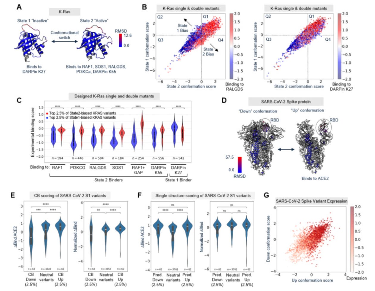 The authors validated CB across seven deep mutational scanning datasets – K-Ras, SARS-CoV-2 spike, the ꞵ2-adrenergic receptor, Src and B-Raf kinases, and two bacterial enzymes (FabZ, MurA). CB-predicted biased variants consistently shifted conformation-specific functions – including effector binding, receptor activation, and enzymatic activity – in the expected directions. A critical control demonstrates the necessity for contrastive scoring: scoring variants against a single backbone structure yielded sets that correlated with expression level (rather than conformational preference) and produced no significant shift in conformation-specific function after expression normalization.